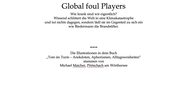 Dieses Buch hat keine Story, aber einen Protagonisten. Mit der Unermüdlichkeit eines Don Quixote rittert „Tom im Turm“, der Bürgeranwalt, gegen Ausbeutung, Etikettenschwindel, Verlogenheit, Gaunerei, Machtbesessenheit und den permanenten Kontrollwahn. Das Gefühl ständigen Geschobenwerdens lässt den mündigen Menschen zur Schachfigur verkommen. Wer sind die Player im Hintergrund? Und wer ist am Ende des Tages der Sieger? Bauer oder König? Auch Könige können geköpft werden, lehrt uns die Geschichte. Aber sind wir belehrbar? Vielleicht doch. „Political Correctness“, „Fridays for Future“, „Me too“, „Wutbürger“ – Wörter, die vor zehn Jahren keiner kannte, sind jetzt in aller Munde. Wörter, denen Taten folgen mögen. Ich bin „Wutbürger“ auf meine Weise. Mein Florett ist die satirische Feder. Also „Spottbürger“? Witz kann sehr wohl eine wirkungsvolle Waffe sein im Kampf um Menschenwürde. In meinen Büchern versuche ich, die Kleider des Königs zu enthüllen. Menschen, die uns mit ihrem Machtgehabe einschüchtern wollen, als das zu zeigen, was sie sind, und Dinge, die unsere Freiheit einschränken, ad absurdum zu führen. Bei mir darf gelacht – und gehofft – werden. Und natürlich steckt in mir ein gewaltiger Brocken „Tom im Turm“.
